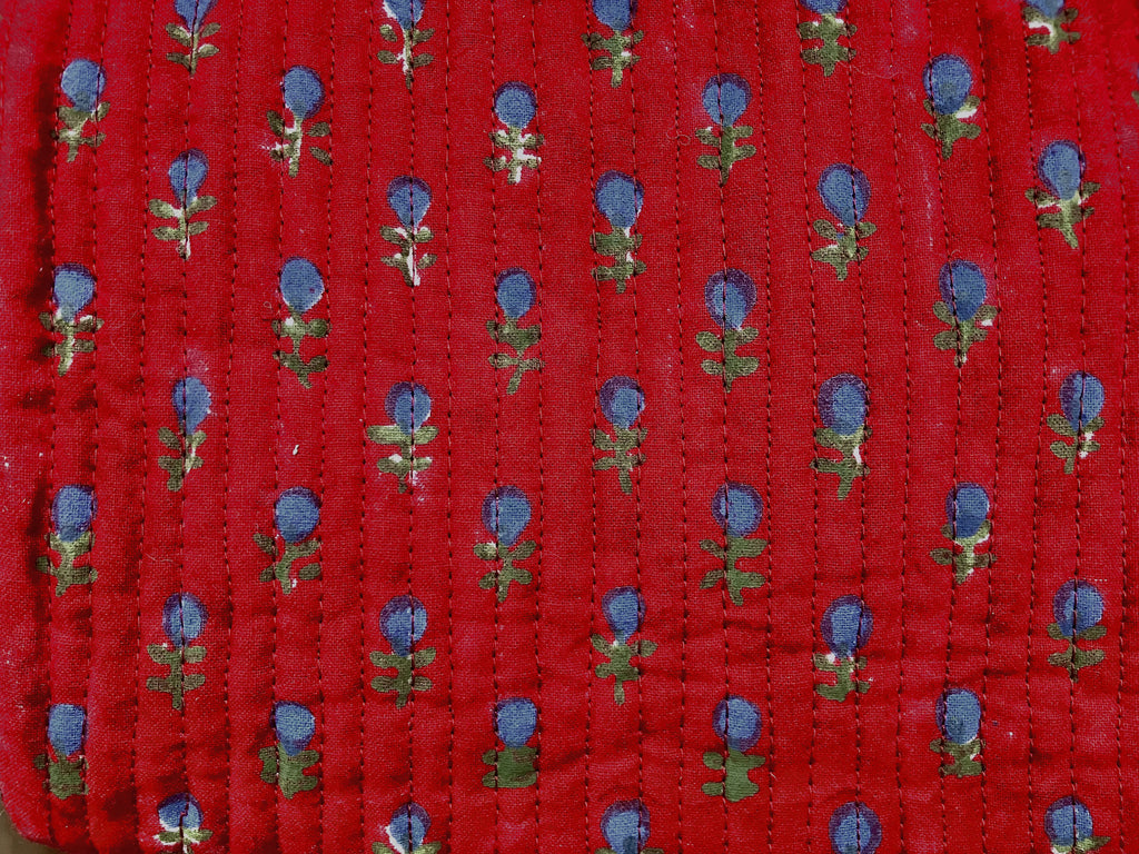 Les motifs délicats, créés en France, sont inspirés des anciens boutis de Provence, et sont ensuite imprimés au tampon de bois, en partenariat avec une ONG indienne engagée dans la valorisation du travail des artisans et des femmes.